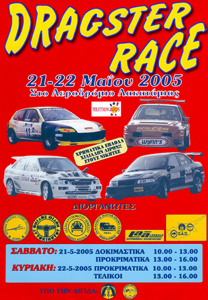 Ο πρώτος αγώνας dragster για το 2005 στην Κύπρο πρόκειται να διεξαχθεί στις 21 και 22 Μαΐου στο αεροδρόμιο της Λακατάμιας. Οι αγωνιζόμενοι παρακαλούνται να κατεβάσουν τα ακόλουθα δύο έντυπα: