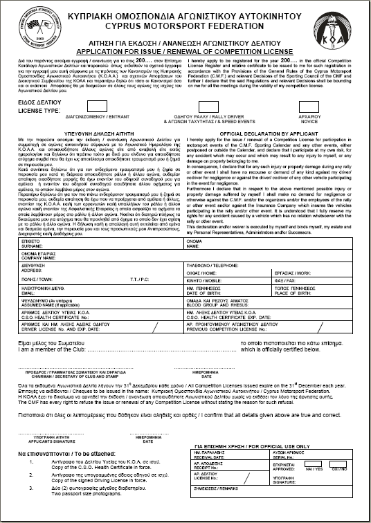 Σχετικό έντυπο δια αίτηση θα βρείτε στο www.greekdragster.com, η στη ιστοσελίδα της Κ.Ο.Α.Α. και μαζί με δυο φωτογραφίες, αντίγραφο του Δελτίου Υγείας (και από τις δυο μεριές) και 30 λίρες θα σταλούν στον κύριο Ηλία Παναγή (τηλ. 99572663) μέσω του ΑKIS Express στη Kennedy στη Λευκωσία.